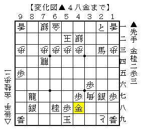本譜は△5四角▲7一飛△8七歩成▲4八飛で、ソフトの評価値-434で後手有利。