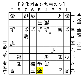 この手順は、5筋を突き捨てて△5七金からがりがり攻める手で、後手玉が固く攻めが繋がっているので後手優勢です。