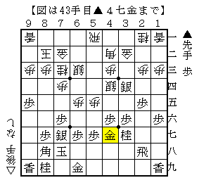 本譜は▲4五銀△7四歩▲3四銀△4二角▲4六歩△6五歩▲7七銀△7三桂▲4七金で、ソフトの評価値+184で互角。