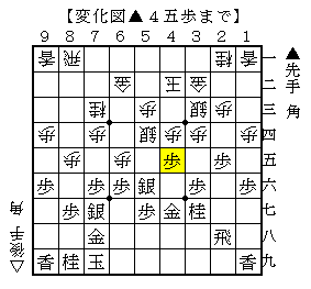 ▲4五歩以下△6六歩▲同銀△8六歩▲同歩△4五歩▲5五銀左で、ソフトの評価値+2で互角。