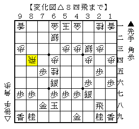 実戦は、8筋の歩の交換をして▲8七歩△7六飛▲8五角でソフトの評価値+458で先手有利となりましたが、△7六飛では△8四飛がありました。ソフトの評価値+141で互角。