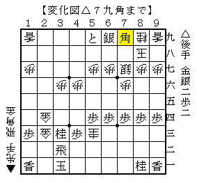 △7九角▲9八玉△9七角成▲同玉△9六銀▲同玉△9五歩▲8六玉△8五銀▲9七玉△9六歩▲8八玉△7八金▲9八玉△9七歩成▲同桂△同香成▲同玉△9二飛まで。
