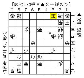▲3二金では▲4二角成がありました。ソフトの評価値+ 794で先手有利。