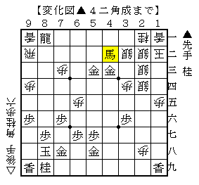 この手順は、▲4三同馬とする手がいい手で、▲4三同金と遊び駒を活用したくなりますが、△4二飛▲同金△3三角が気になります。