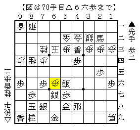 本譜は△6六歩以下▲4二香成△同金▲6六銀△7六桂で、ソフトの評価値-53で互角。