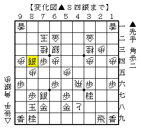 ▲8四銀に△7四銀は▲5四角△6三銀打▲3二角成△5八と▲7五歩で、ソフトの評価値+311で先手有利。