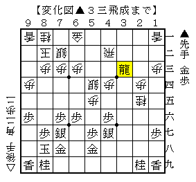 ▲3三飛成△5二飛▲2四龍△2八歩▲2五龍△2九歩成▲同龍で、ソフトの評価値+237で互角。