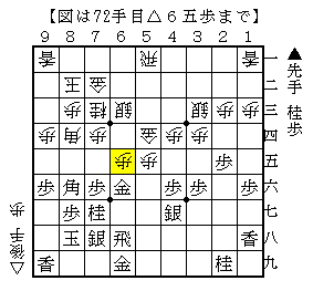 ソフトの推奨手は▲6五歩でしたが、持ち駒の歩がないときに銀ばさみの歩の突き捨ては少し指しにくです。