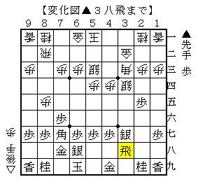上図は、相雁木からの進展で△7二飛と8二の飛車が寄った局面。ソフトの評価値+183で互角。