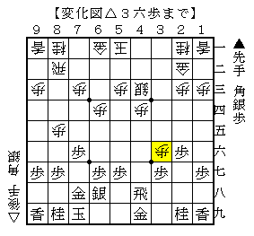 上図は、後手雁木からの進展で△3六歩と突いた変化手順で、ソフトの評価値+171で互角。