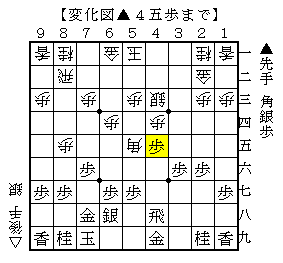 この手順は、▲4五歩から飛車と角の交換で、こうなると先手の4九の金の1段金が後手の飛車打ちを防いでいるのでまずまずの展開です。