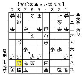 ▲8八銀に△9八馬なら、▲4四歩△5四銀▲4三歩成△4五香▲4六歩で、ソフトの評価値+762で先手有利。