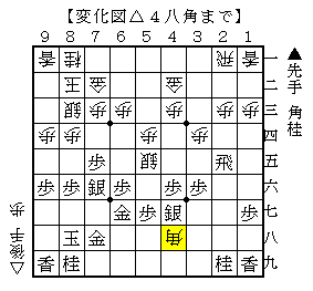 △4八角以下▲8五歩△同歩▲同銀△8四歩▲7六銀△2四歩▲2七飛△2五歩▲2二歩△同飛▲3一角△3二飛▲4二角成△同飛▲2五飛で、ソフトの評価値-46で互角。