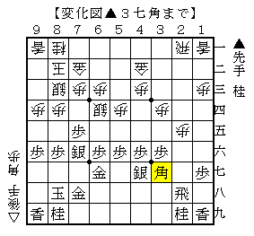 ▲3七角は△2六歩に▲同角の受けの自陣角ですが、桂馬を得しているのでいい勝負のようです。