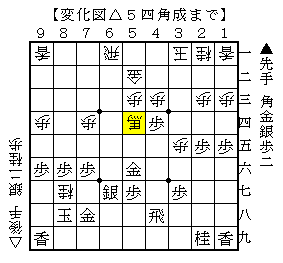この局面が先手が少し危ないようでもまだ意外としっかりしていると思えばこの展開になりますが、後手も△5四角成と攻防に馬を利かせる形なので、悪いなりに粘れそうです。
