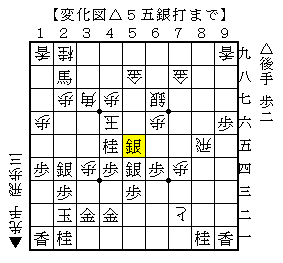 △5五銀打▲同飛△同銀▲同玉△3七馬▲同桂△5四飛▲4六玉△5五角▲3六玉△3七角成まで。