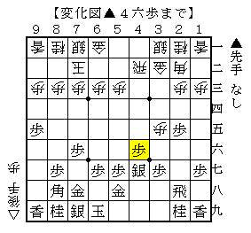 ▲5八金△4六歩▲同歩△同飛▲4七銀△4二飛▲4六歩で、ソフトの評価値+182で互角。