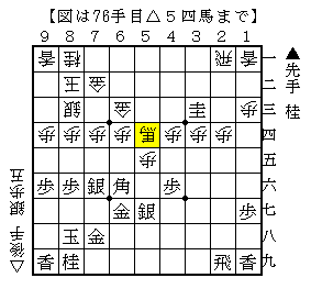 本譜は、▲4七桂△3八銀▲5五桂△2九銀成▲6三桂成△同馬で、ソフトの評価値-928で後手優勢。