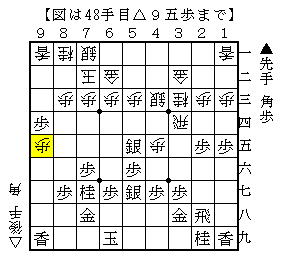 後手は9筋から動いてきたのですが、▲9五同香とするのは△8四角が両取りになるので、先手がまずそうです。