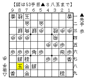 本譜は▲8六歩△8三銀▲8七銀△7二金▲8八玉で、ソフトの評価値-10で互角。
