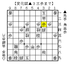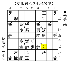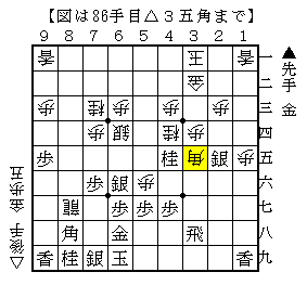 本譜は△3五角以下▲7七金打ですが△8二龍があり以下▲3四銀△3七歩で、ソフトの評価値-254で互角。