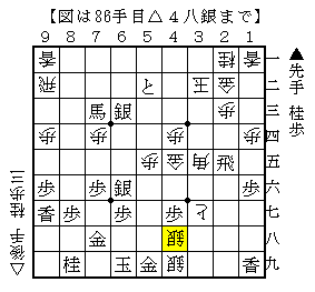 △3五同金以下▲7九玉で、ソフトの評価値+281で互角。