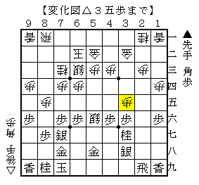 △3五歩に▲5七歩なら、△3六歩▲5六歩△3七歩成▲同銀△3八角で、ソフトの評価値-55で互角。