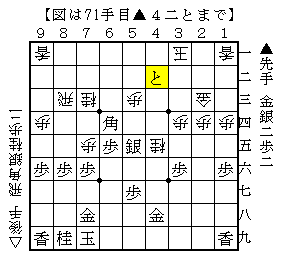 実戦は△4二同玉に▲4四銀だったのですが▲4四銀では▲5三角成がありました。