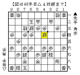 上図は、角換わりから後手右玉の進展で後手が3筋の歩を交換してから3五の銀が△4四銀と引いた局面。ソフトの評価値+179で互角。