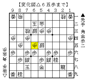 △6五歩以下▲6八金打△6六銀▲8八銀△7五歩▲6七歩△5五銀▲2二角△3三角▲同角成△同桂▲7五歩で、ソフトの評価値+284で互角。