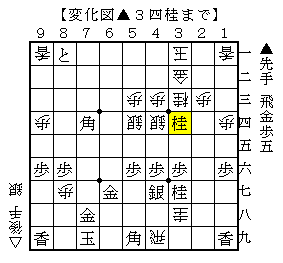 ▲3四桂△5九飛成▲6九歩△2一玉▲4一角成△8八銀▲同金△同歩成▲同玉△3一金打▲同馬△同金▲2二金△同金▲3一金△同玉▲7一飛△4一角▲4二銀△2一玉▲4一飛成△1二玉▲2二桂成△1三玉▲1一龍△2四玉▲1三角△3四玉▲3五金△同銀▲同角成まで。
