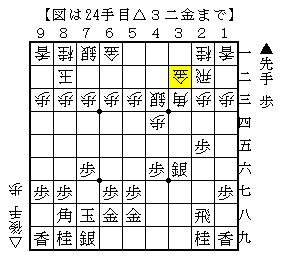 △3二金は先手が急戦にくるときの事前の受けですが、対局中は、先手は急戦でいくか持久戦でいくか少し迷いました。