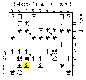 ▲7八金以下△3二飛▲1六歩△5一角▲2六飛△3五歩▲4七銀で、ソフトの評価値+218で互角。