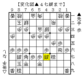 ▲4七銀以下△3四飛▲4五歩△3三桂▲4四歩△同銀▲8五歩で、ソフトの評価値+58で互角。