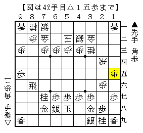 上図は、横歩取り青野流からの進展で△1五歩と端歩を伸ばした局面。ソフトの評価値-152で互角。