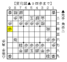 後手は狙いの1筋の端攻めで、△1七歩に▲同香では△1八歩、▲同桂では△1八歩▲同香△2九角があるので、先手は1筋を受けずに▲9四歩と突いてどうかという局面です。