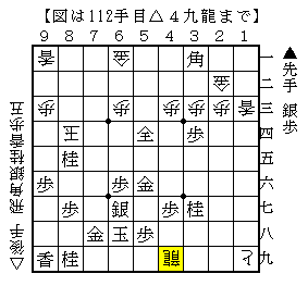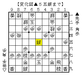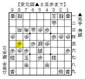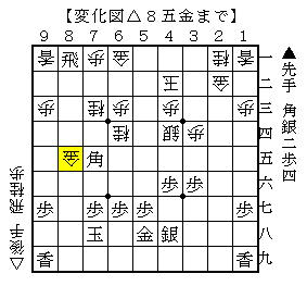 本譜は△5七銀以下▲7七銀打△6八銀成▲同金△8五桂で、ソフトの評価値-434で後手有利。