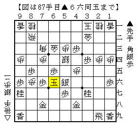 ▲6八同金以下△1二香▲7九銀打△2九飛▲6四歩△5四歩▲4六角で、ソフトの評価値+144で互角。
