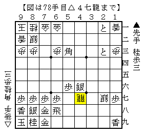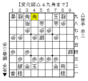 この手順は、▲4三成銀から▲3三歩と攻める手ですが、△4七角と打って先手の飛車の活用をおさえます。