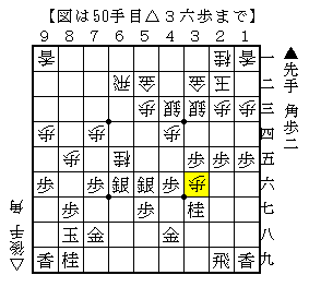 まだ先手玉はしっかりしていますが、後手は△3三銀と壁銀を解消してからどこかで△3九角のような手を狙ってどうかという展開です。