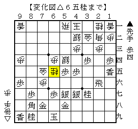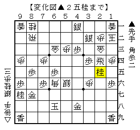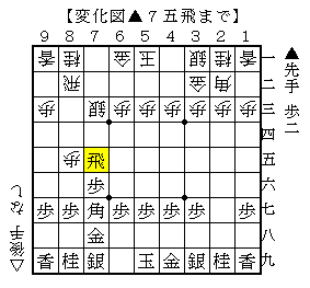数手前に▲7七金と上がった形は、大駒の交換になるとやや先手が弱いのが欠点のようで、△7三桂と跳ねられた局面はすでに先手が指しにくいかもしれません。