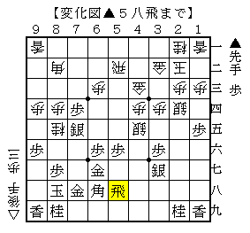 この手順の△3八銀の時点の駒割りは、銀と香車の交換でやや先手が駒損ですが、それ以上に後手の飛車と馬と銀の攻めが厳しく後手勝勢です。