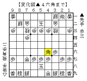 ▲4六角では同じような意味で受けるなら▲4八銀のような手もありそうですが、先手が少し指しにくいようです。