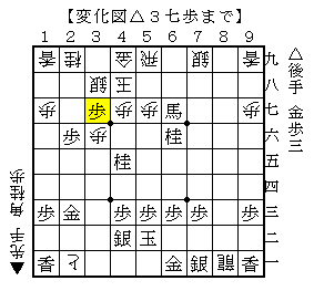 ▲5六銀以下△7三桂▲4五歩△6五歩▲7七角で、ソフトの評価値+313で先手有利。