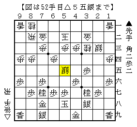本譜は▲4六歩△5四銀▲2七歩△3五角▲同歩△5五銀で、ソフトの評価値-244で互角。