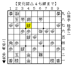 △4七銀に▲同銀なら△同歩成▲同金△4六歩▲同金△6五歩▲4五金△6六歩▲3四歩△3七歩成▲同玉△4七飛▲3八玉△4九銀▲3九玉△4五飛成▲3三歩成△同桂で、ソフトの評価値-50000で後手勝勢。
