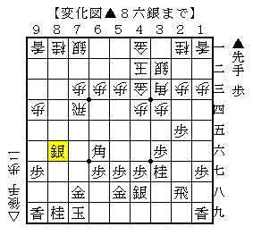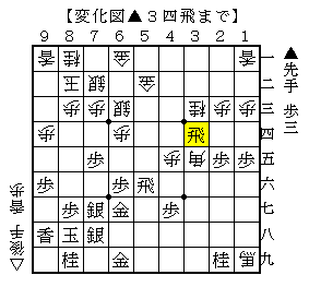 この手順は、△4五銀とぶつける手ですが清算してから▲3四銀と打ち込む手で、3五の歩を拠点として攻めていい勝負のようです。