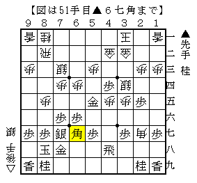 後手は△4五桂と跳ねて受けますが▲同銀から▲4四歩と拠点を作って▲6七角としてどうかという展開です。