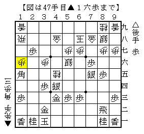 後手は3筋の位を取って△2七角と打って自陣に馬を利かす形で、やや玉の周辺の盤面を大きく使った展開です。