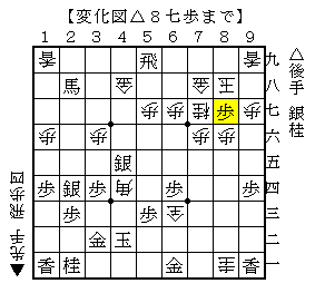 △8七歩に▲同玉なら△8九飛成▲8八金△9五桂▲9六玉△8八龍▲8二飛△3一玉▲8五玉△9二金で、ソフトの評価値-2306で後手勝勢。